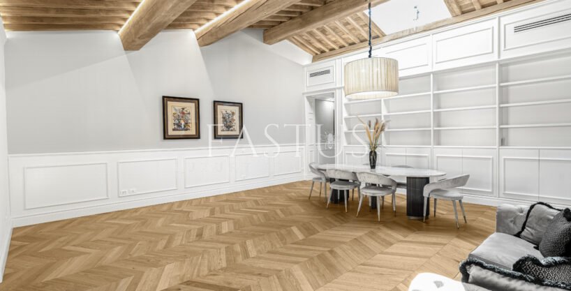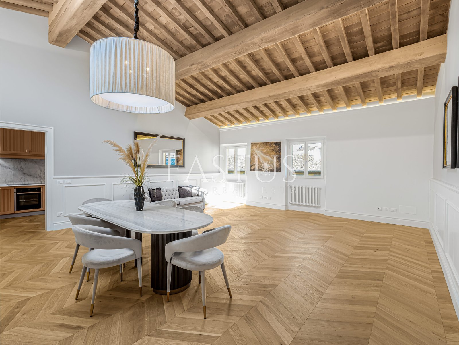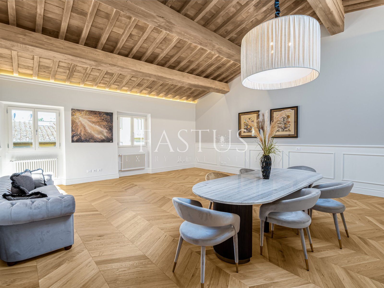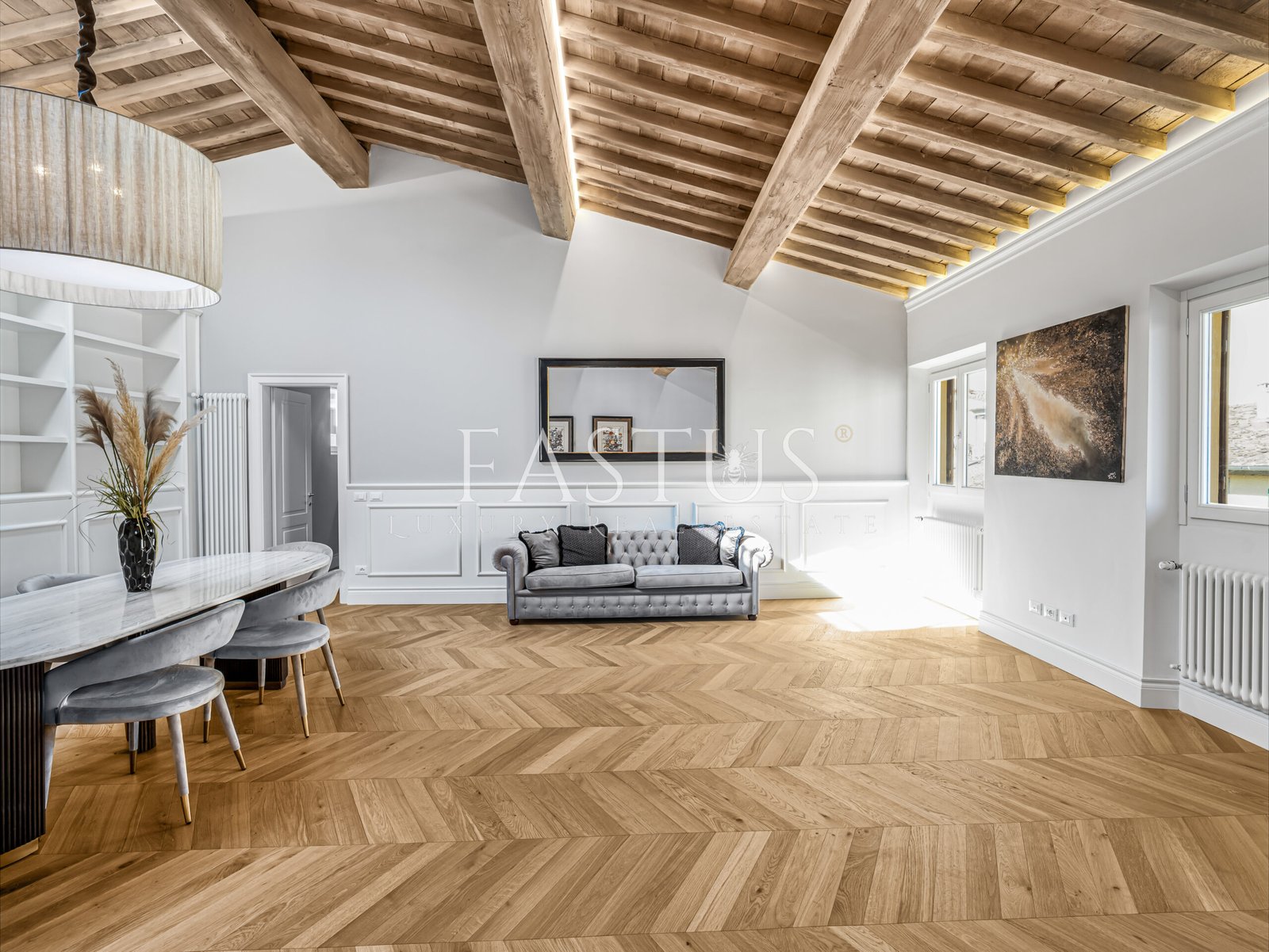 L’ingresso dell’abitazione introduce a un soggiorno di rappresentanza di eccezionale ampiezza, uno spazio d’impatto che unisce fascino storico e comfort contemporaneo. I soffitti alti con travi in legno a vista, la luce che filtra da ampie finestre panoramiche e l’eleganza degli arredi rendono questo ambiente il cuore pulsante della casa: perfetto per intrattenere ospiti, lavorare in smart working con ispirazione o godersi momenti di relax in un’atmosfera unica, sospesa tra la storia e il design.