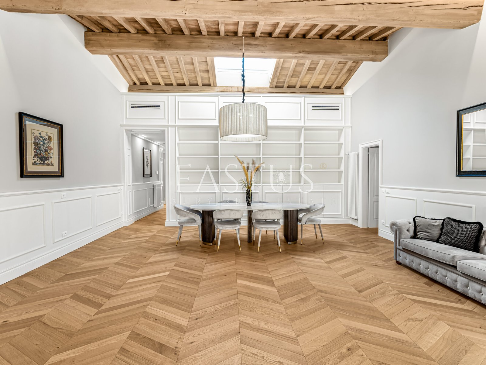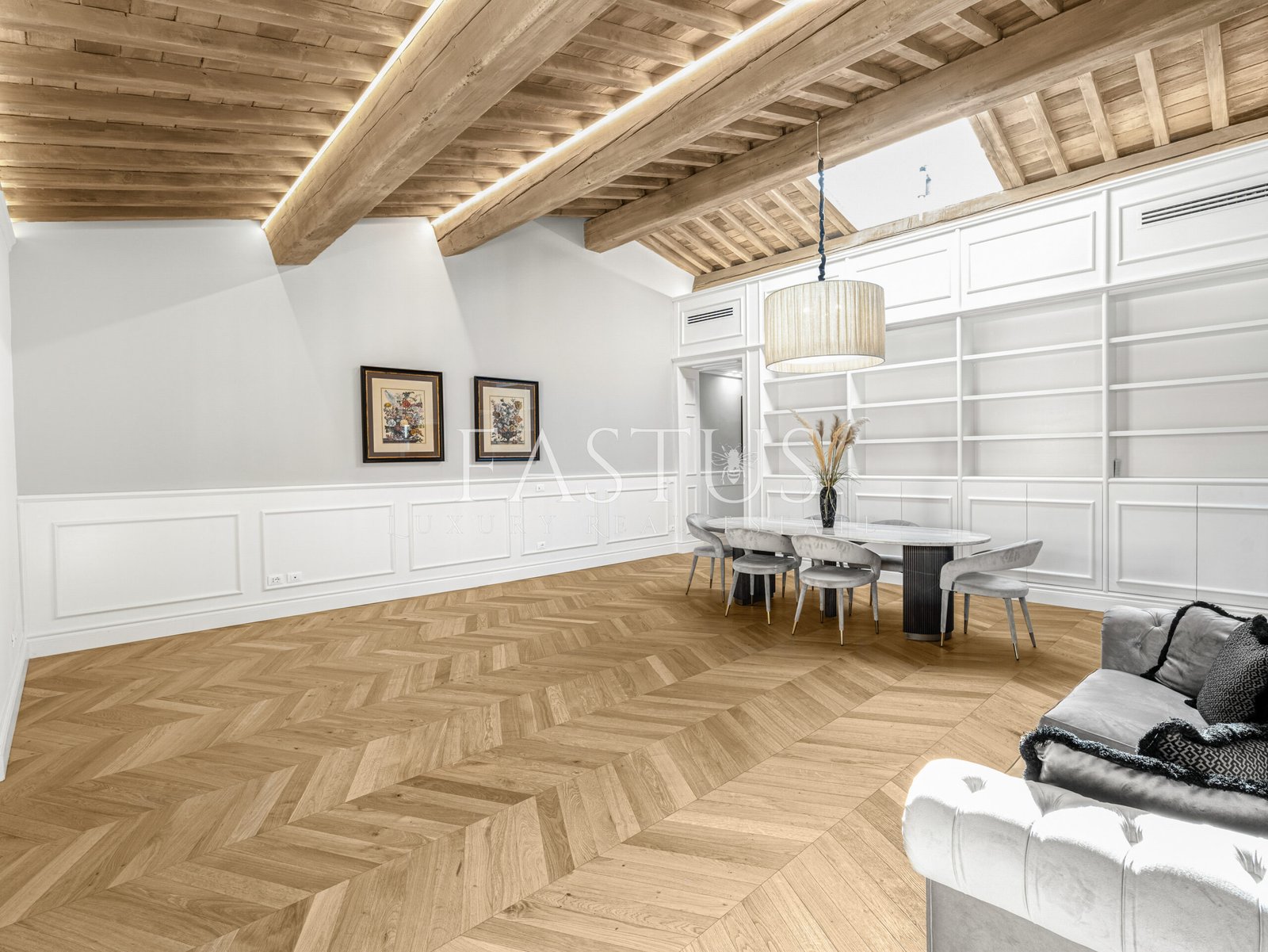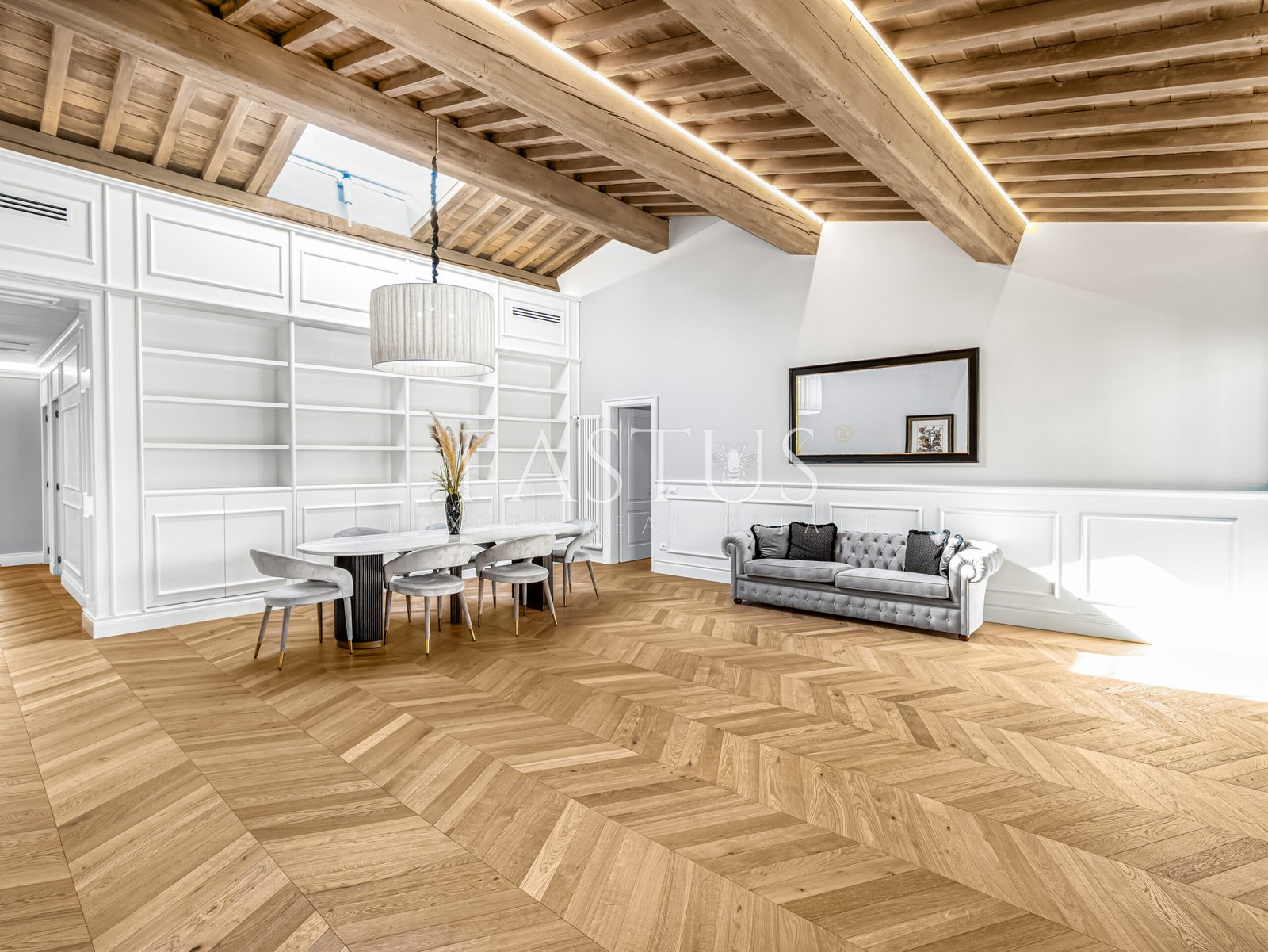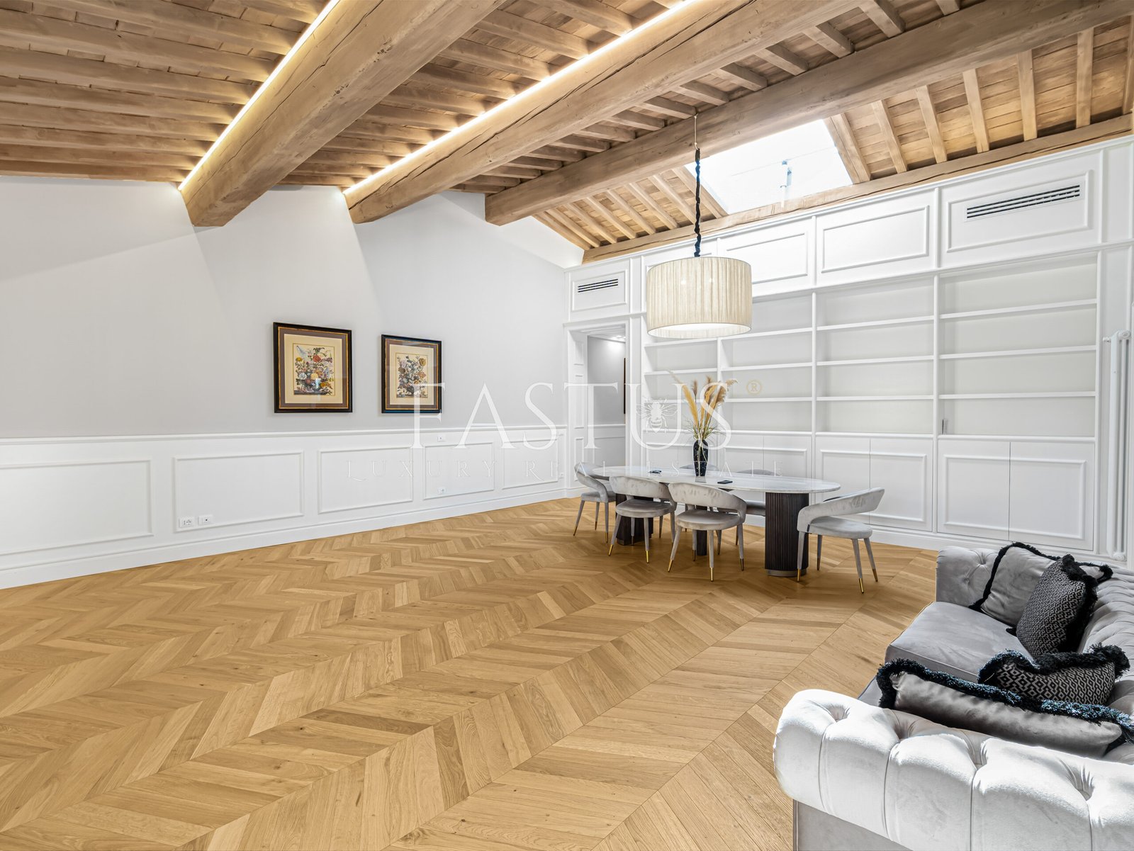 L’ingresso dell’abitazione introduce a un soggiorno di rappresentanza di eccezionale ampiezza, uno spazio d’impatto che unisce fascino storico e comfort contemporaneo. I soffitti alti con travi in legno a vista, la luce che filtra da ampie finestre panoramiche e l’eleganza degli arredi rendono questo ambiente il cuore pulsante della casa: perfetto per intrattenere ospiti, lavorare in smart working con ispirazione o godersi momenti di relax in un’atmosfera unica, sospesa tra la storia e il design.
