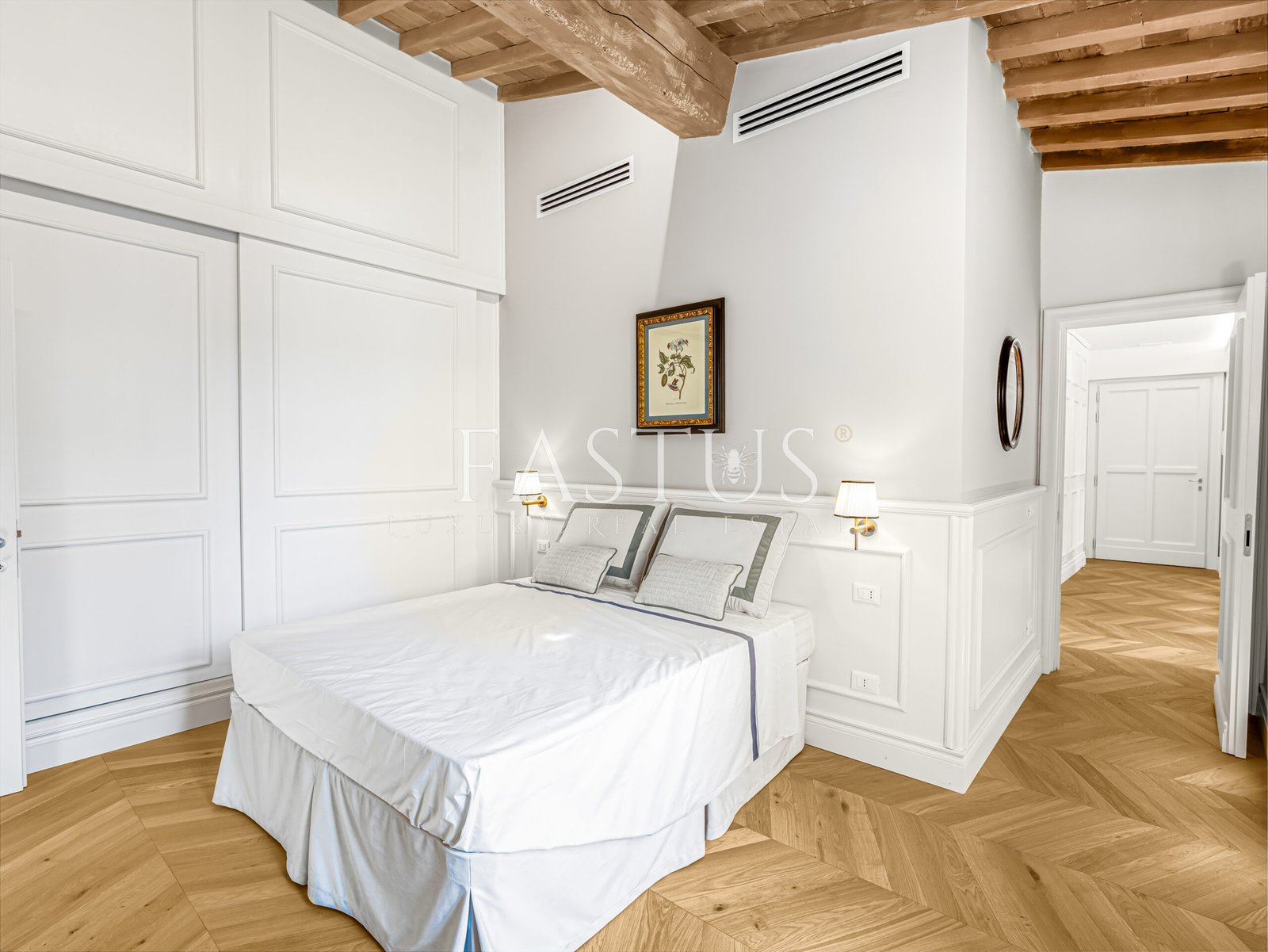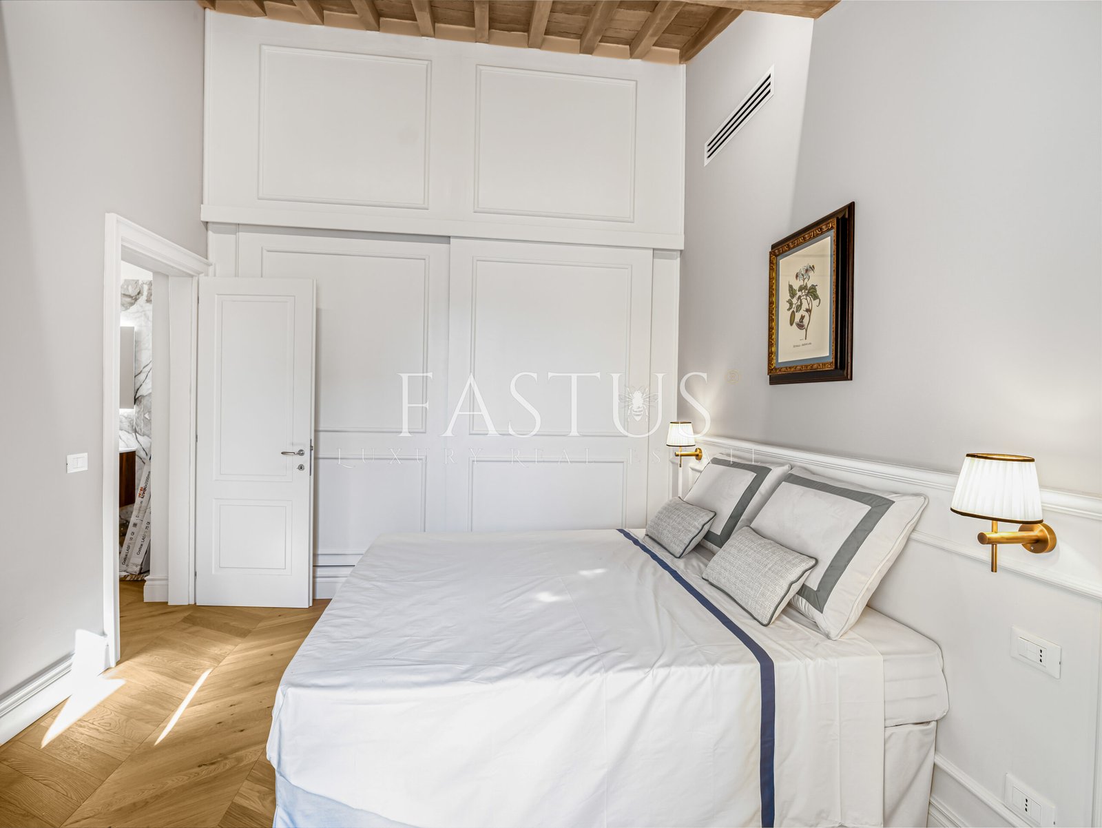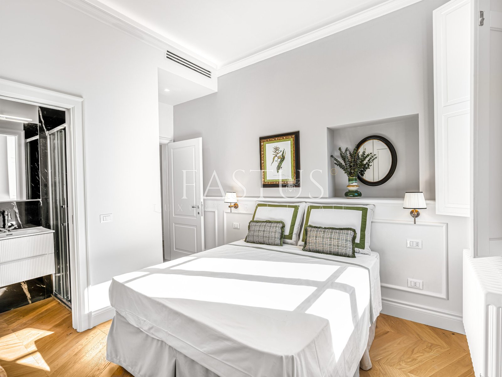 Le camere da letto sono autentiche suite, curate nei minimi dettagli per offrire il massimo del comfort e della privacy. Spaziose e silenziose, sono arredate con armadiature su misura e impreziosite da finiture di pregio. Una delle camere, in particolare, si distingue per la presenza di un raffinato bagno en suite e una terrazzina privata che si affaccia su un cortile interno silenzioso e verde, offrendo un angolo riservato di pace nel cuore della città. Gli altri bagni, anch’essi realizzati con materiali pregiati come marmi naturali e dotati di finiture di design, completano l’esperienza di comfort e lusso.