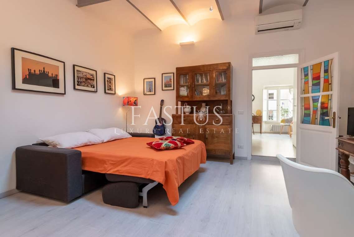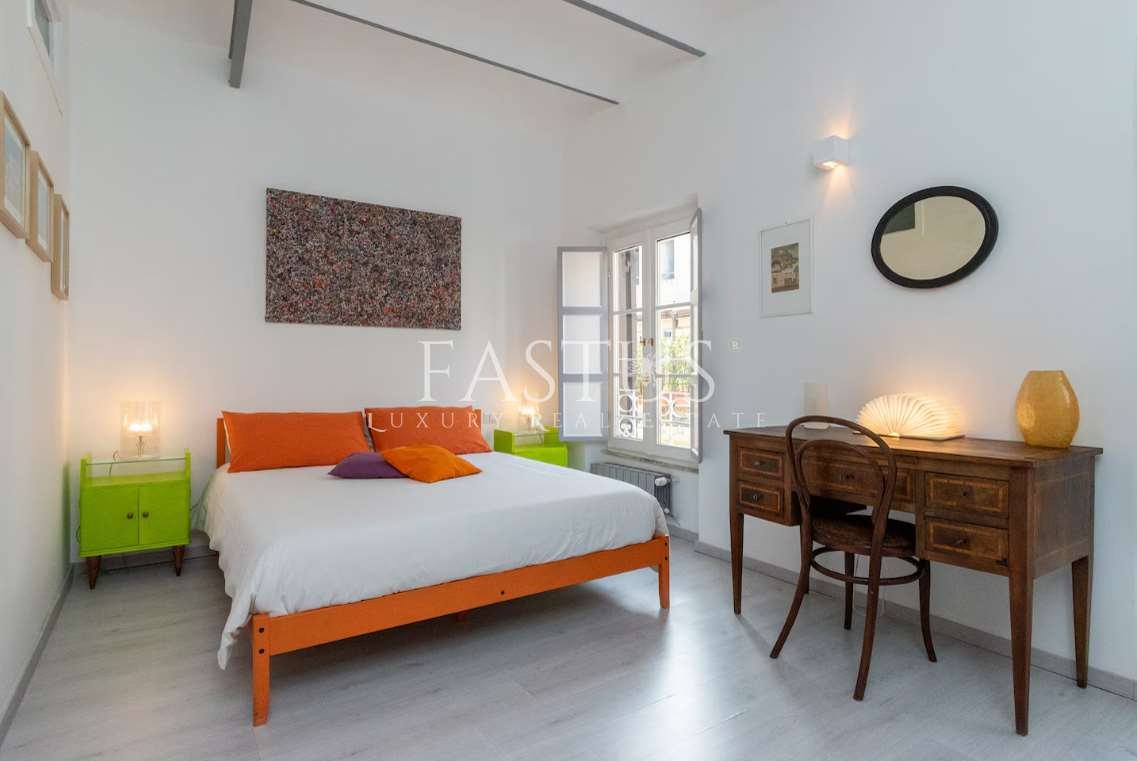 Camera matrimoniale: luminosa, con due ampie finestre che si affacciano su Via degli Zingari, pavimenti in parquet e soffitti con volte a botte tipiche di fine Ottocento, alti oltre 3 metri, che conferiscono grande respiro agli ambienti.