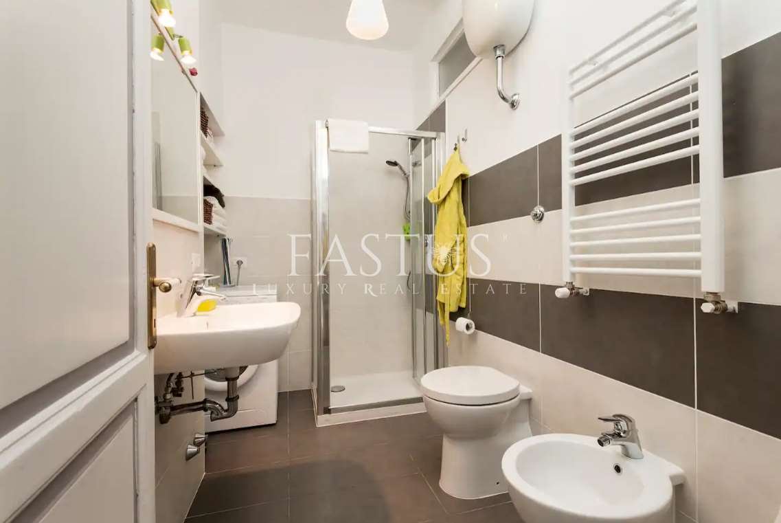 Bagno principale: cieco ma con due punti luce, rifinito con materiali di pregio.