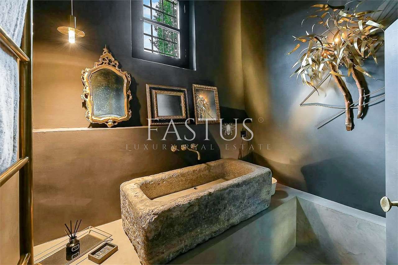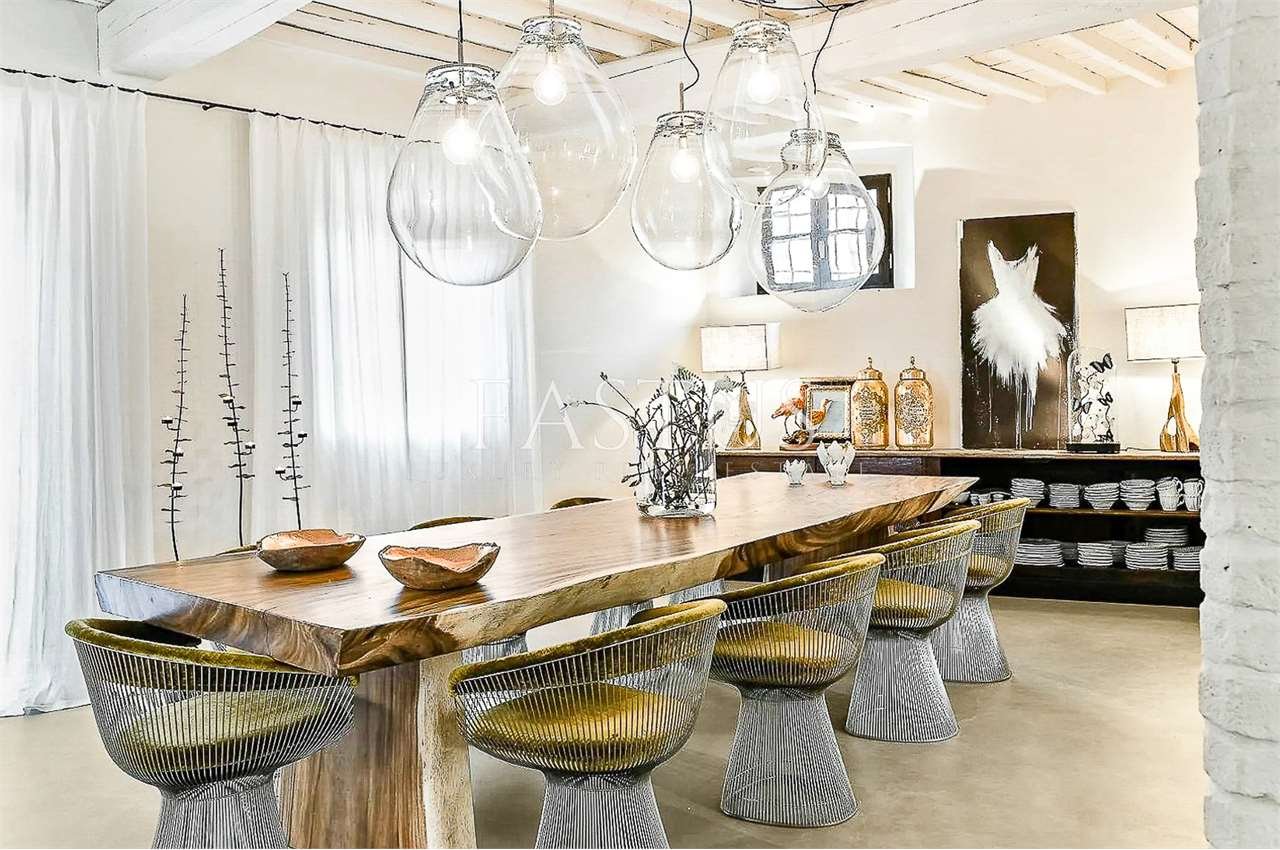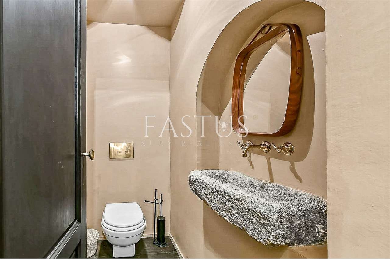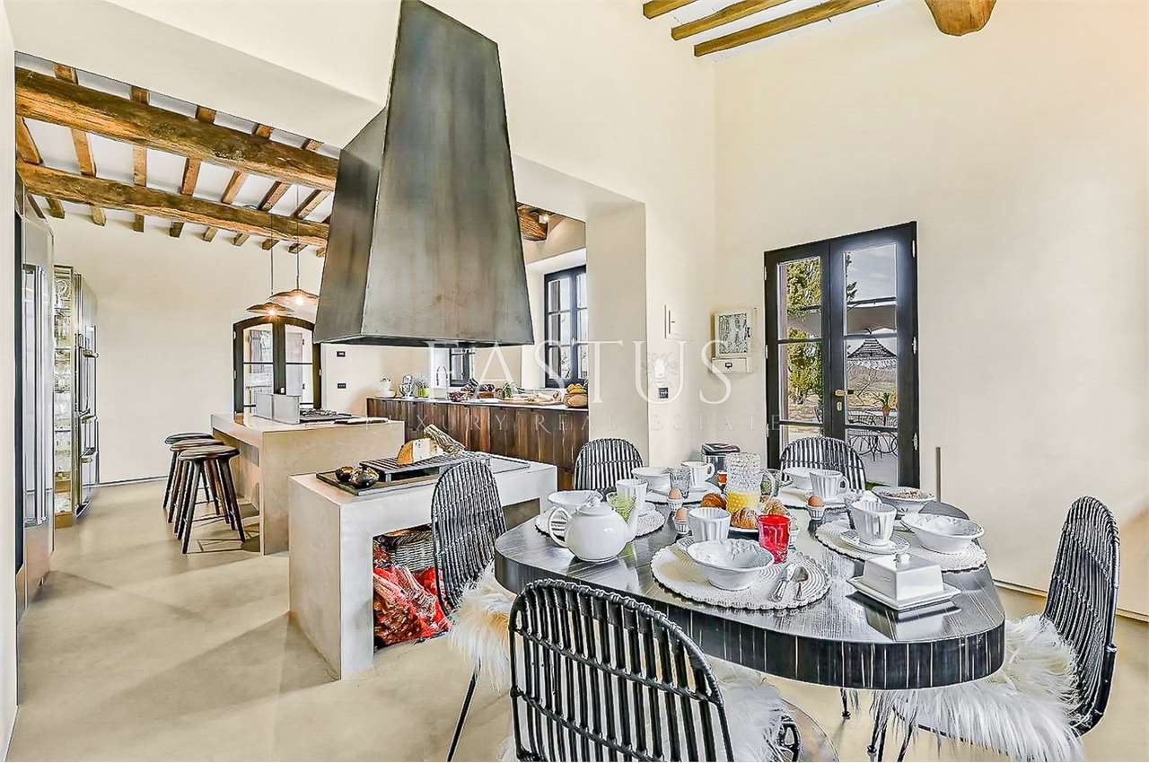 Gli ambienti interni, caratterizzati da soffitti alti con travi a vista, archi in mattoni e ampie finestre che trasformano ogni scorcio in un quadro naturale, accolgono un raffinato connubio di antiquariato, broccati, elementi di design mid-century e arredi mediterranei dalle linee rilassate. La zona giorno, luminosa e accogliente, ruota attorno a una cucina moderna e completamente attrezzata, pensata per coniugare funzionalità e stile.