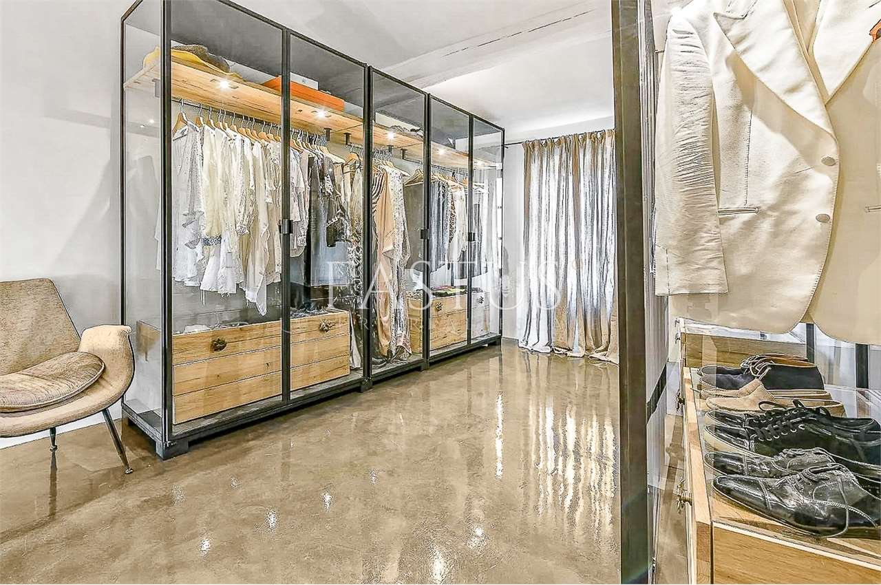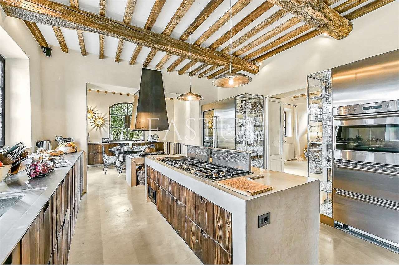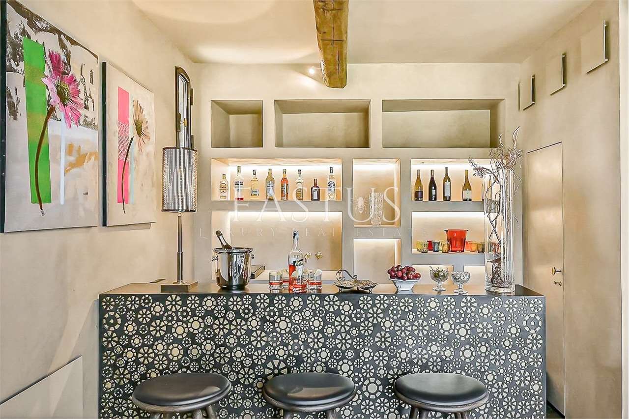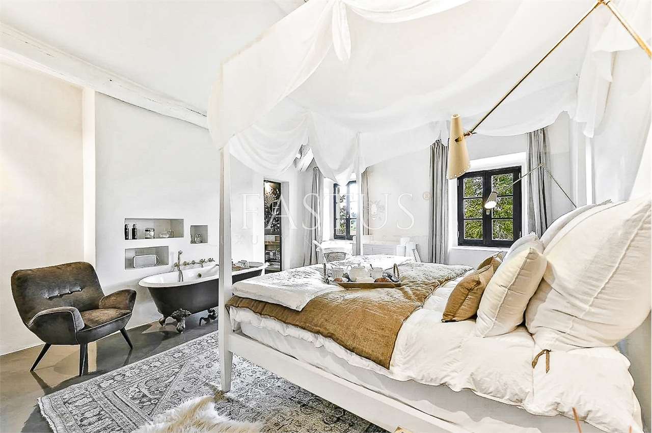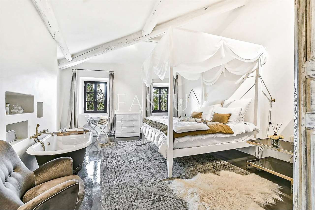 Gli ambienti interni, caratterizzati da soffitti alti con travi a vista, archi in mattoni e ampie finestre che trasformano ogni scorcio in un quadro naturale, accolgono un raffinato connubio di antiquariato, broccati, elementi di design mid-century e arredi mediterranei dalle linee rilassate. La zona giorno, luminosa e accogliente, ruota attorno a una cucina moderna e completamente attrezzata, pensata per coniugare funzionalità e stile.