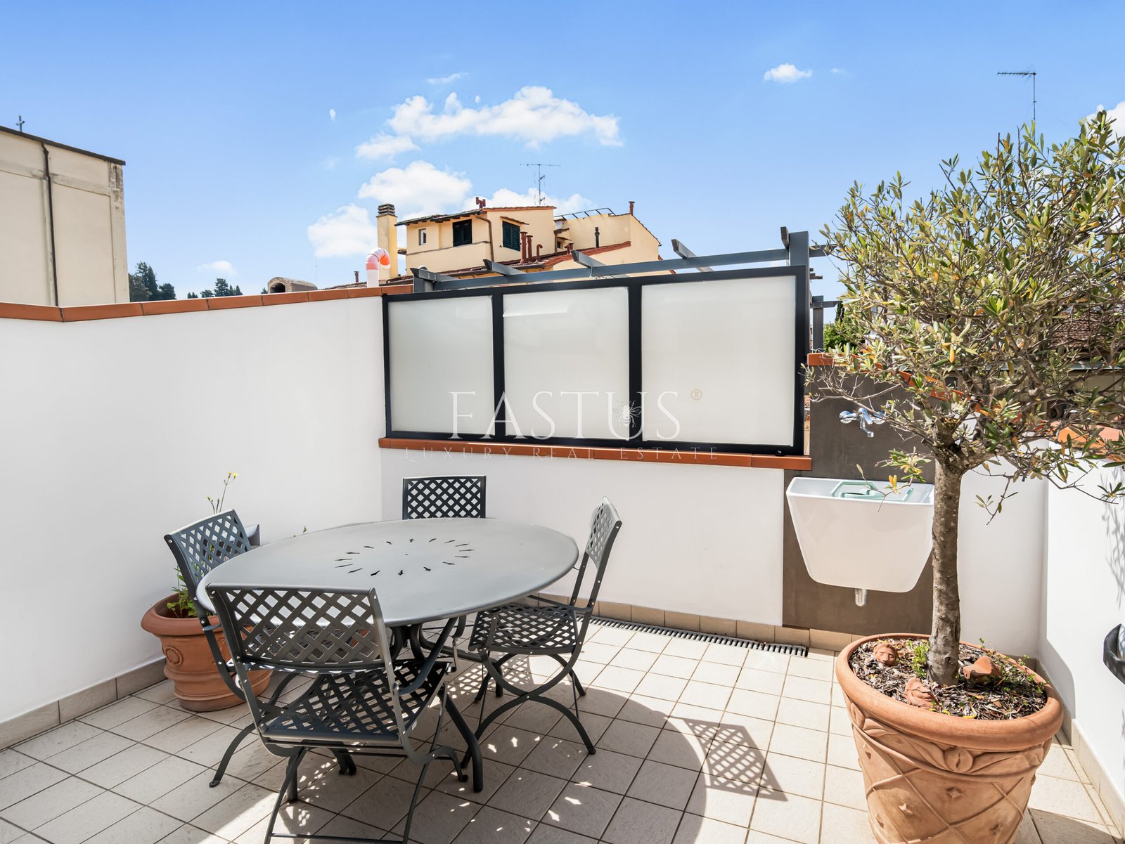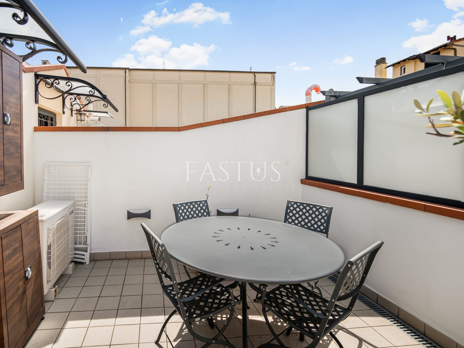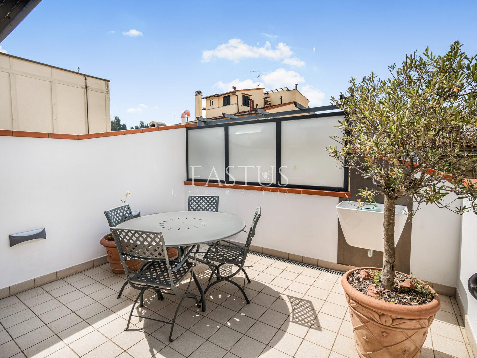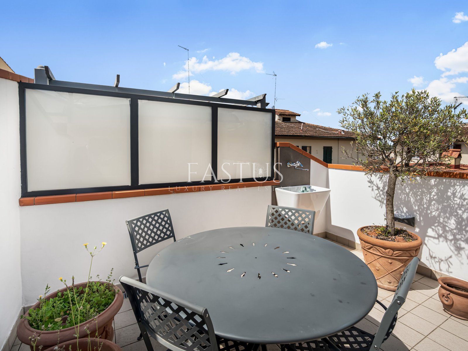 Completano la proprietà una terrazza abitabile e un ampio balcone vivibile di circa 20 mq, arredato con tavolino da esterno e impreziosito dalla presenza scenografica di un ulivo in vaso di terracotta. Il tutto arricchito da luci ambientali, che creano un’atmosfera calda e accogliente anche di sera.