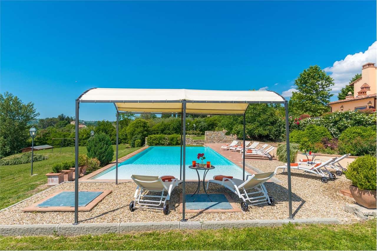 All’esterno, un magnifico giardino di circa 5.000 mq ospita una piscina a sale con doccia in pietra acqua calda/fredda, oltre a una grande loggia attrezzata con forno, barbecue e angolo cucina. La pavimentazione esterna è in cotto umbro fatto a mano e pietra scalpellata.