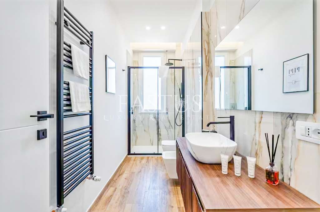Bagno finestrato, elegante e completamente ristrutturato, con sanitari moderni, finiture raffinate e materiali di alta qualità.