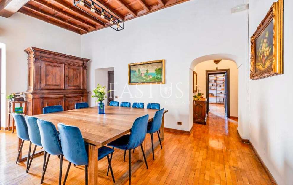 Tra gli elementi più pregiati dell’appartamento spiccano i soffitti a cassettoni originali, i pavimenti in legno pregiato nelle stanze principali e quelli d’epoca nella galleria, oltre al camino monumentale nella zona reception, che diventa il fulcro caldo e conviviale della casa. L’eleganza dei dettagli si unisce a comfort moderni, tra cui l’ascensore con accesso diretto al piano, che garantisce praticità senza compromettere il prestigio e l’atmosfera unica della residenza.