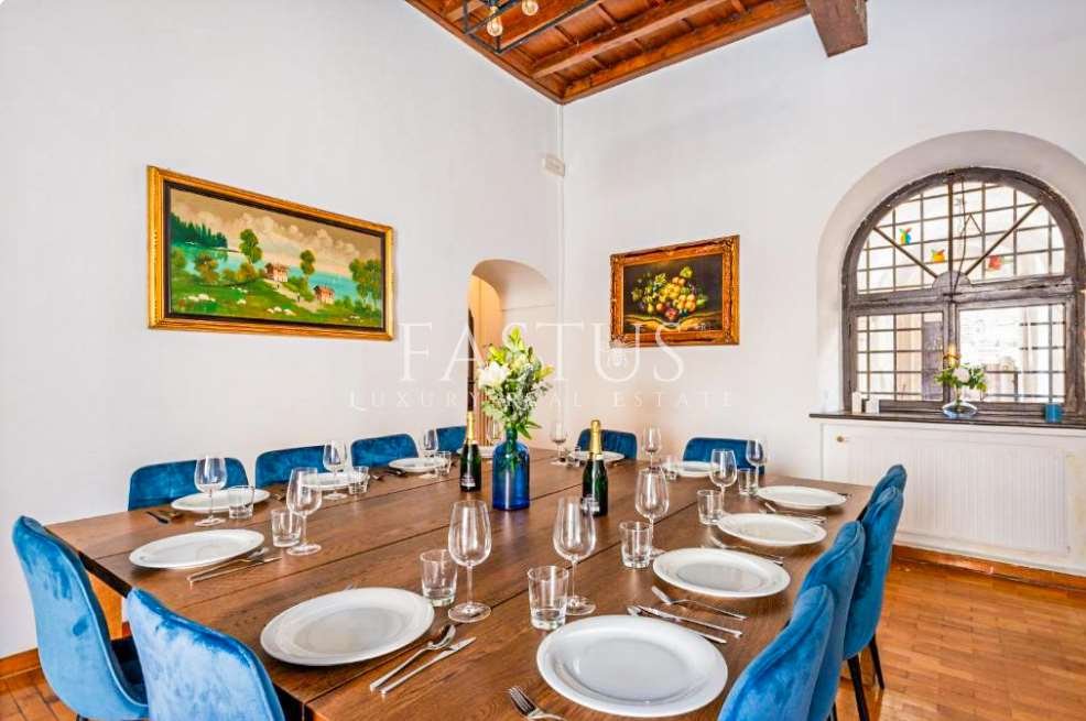 Varcando la soglia, si è immediatamente avvolti da un senso di armonia e raffinatezza: una magnifica galleria, arricchita da pavimenti d’epoca e dettagli architettonici originali, conduce ai saloni principali della proprietà. La zona di rappresentanza si compone di due saloni a cascata, spaziosi e luminosi, con grandi finestre che offrono una vista suggestiva sui tetti della città e sui monumenti circostanti, inondando gli ambienti di luce naturale e creando un’atmosfera accogliente e maestosa al tempo stesso. Questi spazi sono ideali per ricevimenti, cene eleganti, eventi esclusivi o semplicemente per momenti di relax immersi nella storia e nell’arte.
