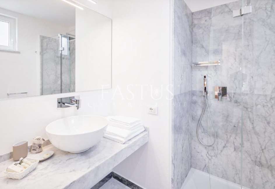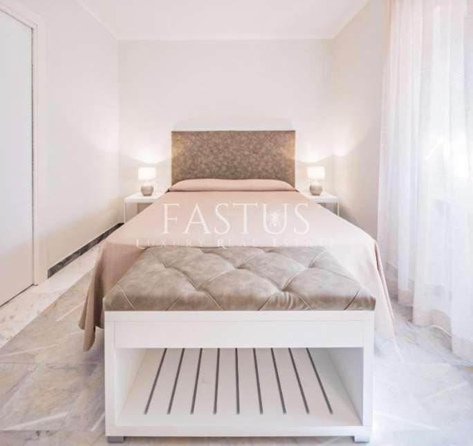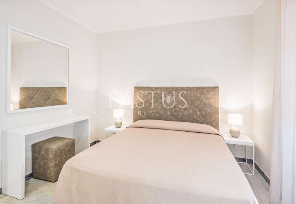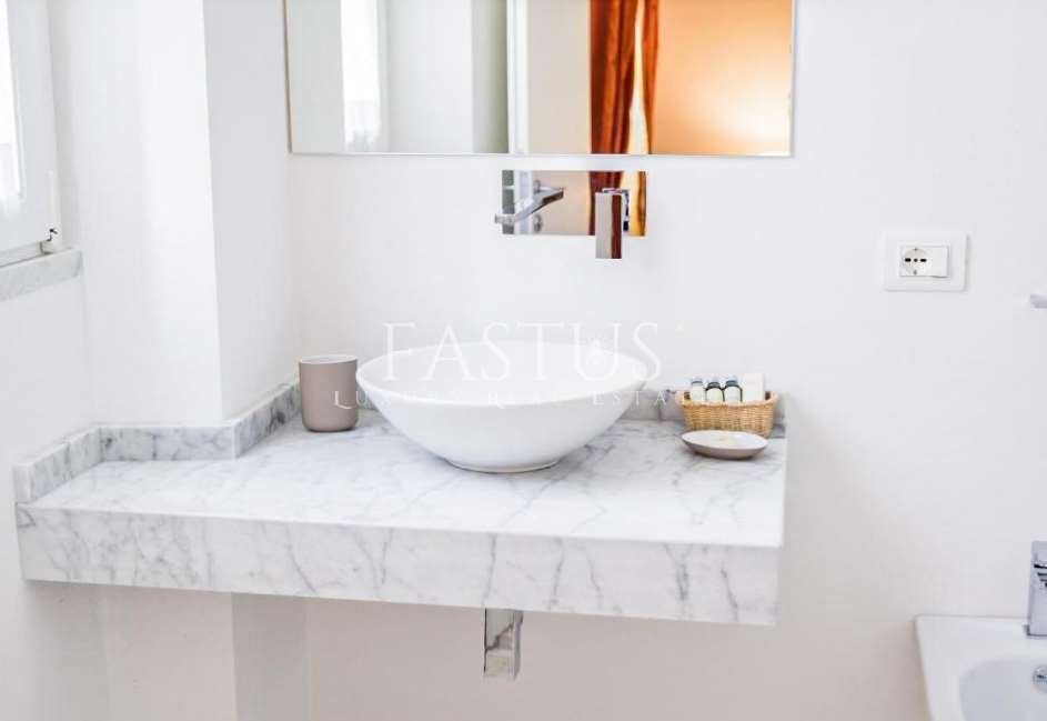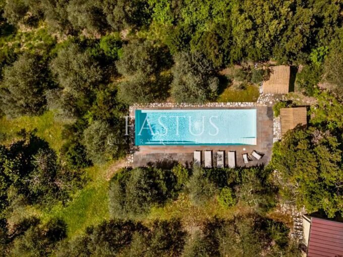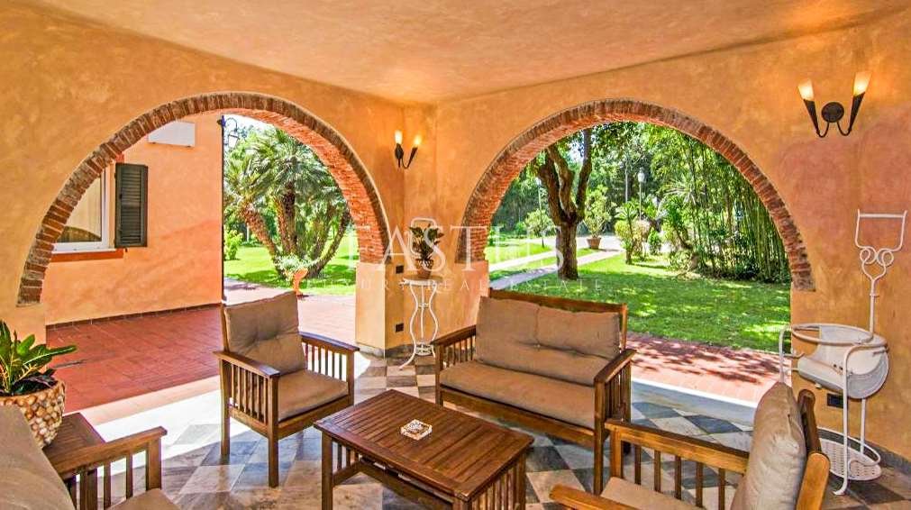 La villa si sviluppa su circa 2.500 m² di superficie interna, circondata da un parco privato di 5.500 m², un’oasi verde curata nei minimi dettagli. Il giardino, concepito come un vero e proprio museo all’aperto, è arricchito da lecci secolari, pini marittimi e splendidi esemplari di flora mediterranea. Due pozzi storici, uno in marmo bianco di Carrara del XVIII secolo e uno a cupola risalente all’anno 1000, testimoniano la storia millenaria del luogo e diventano elementi scenografici suggestivi all’interno della vegetazione rigogliosa.