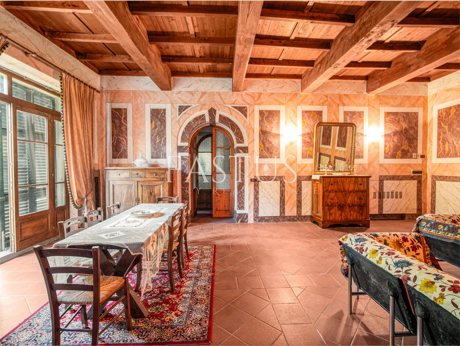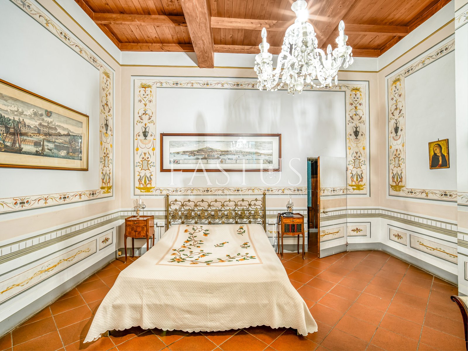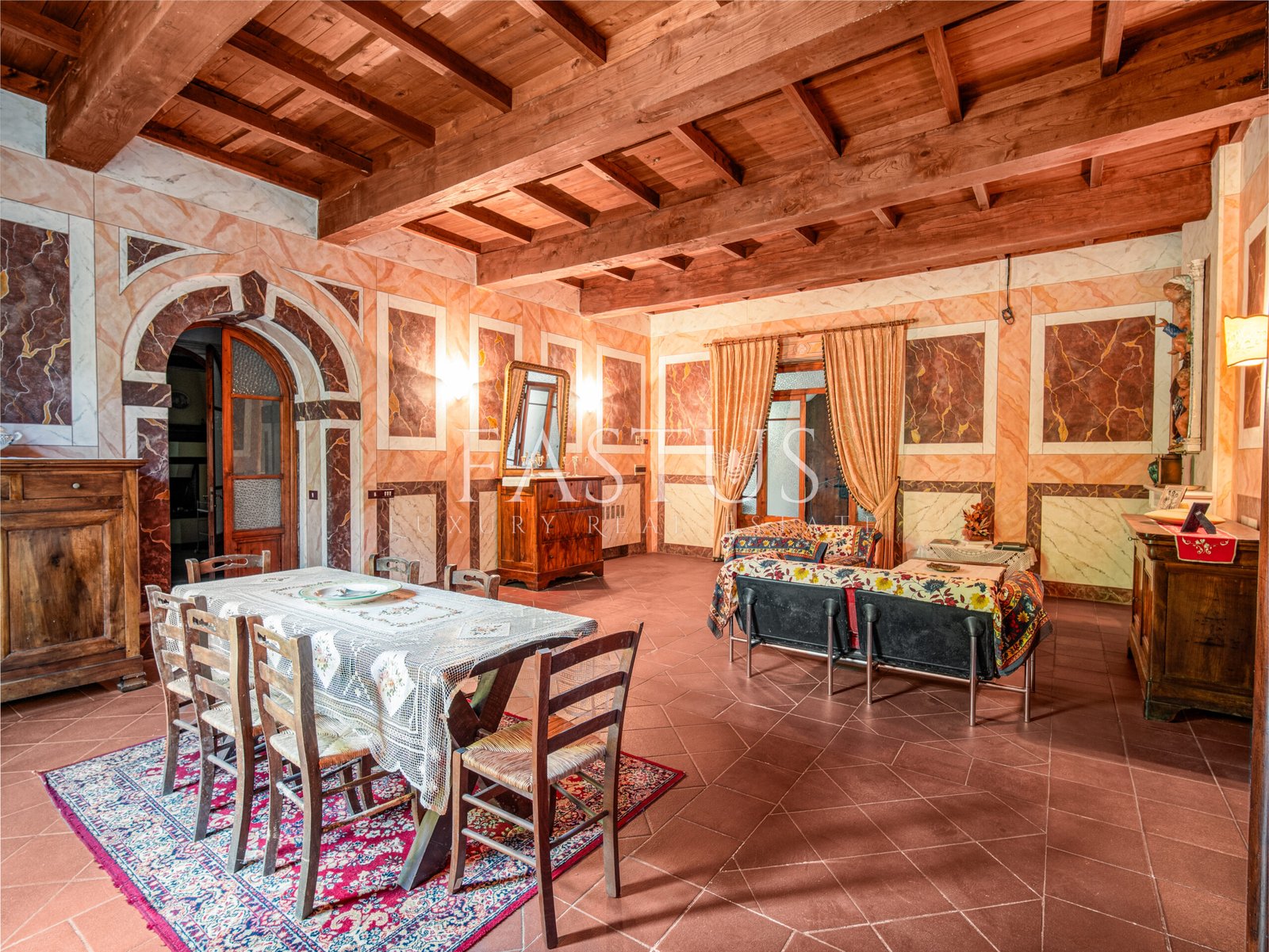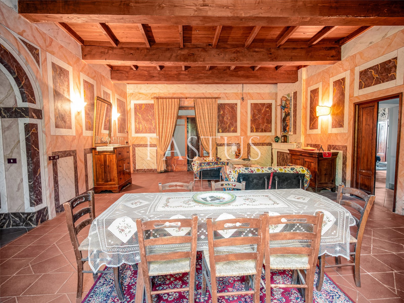 All’interno, la villa principale di circa 780 mq si sviluppa su tre piani, rivelando un glorioso passato attraverso i suoi affreschi originali, i pavimenti in cotto e le travi in legno che ne testimoniano l’autenticità. Al piano terra, un sontuoso salone affrescato accoglie gli ospiti con un elegante camino in marmo, affiancato da una spaziosa cucina con un antico camino in cotto e una sala da pranzo impreziosita da un altro raffinato focolare. Completano questo piano una seconda cucina con forno a colonne, uno studio e due bagni di servizio, garantendo comfort e funzionalità.