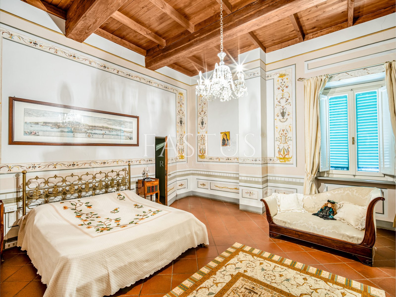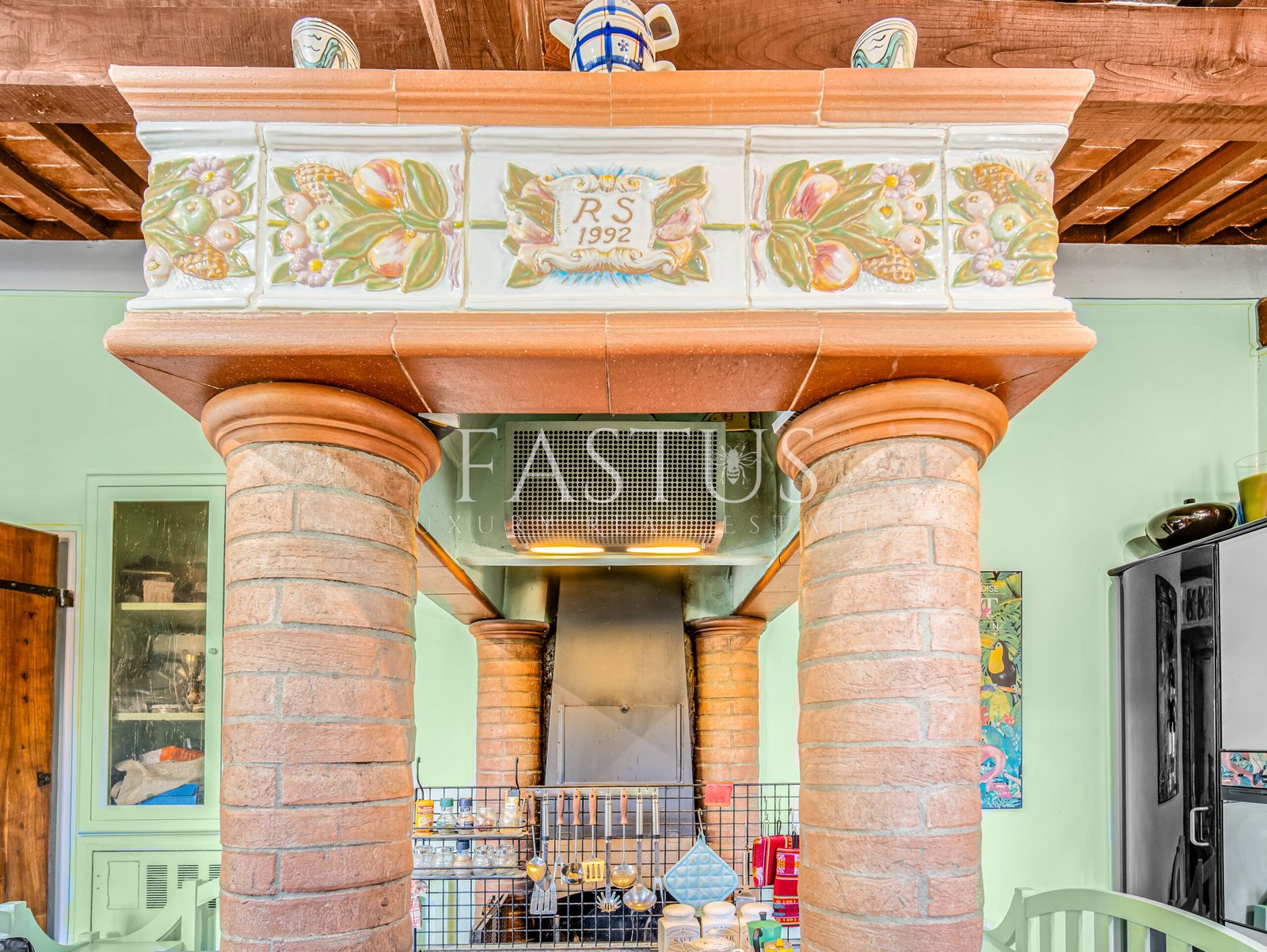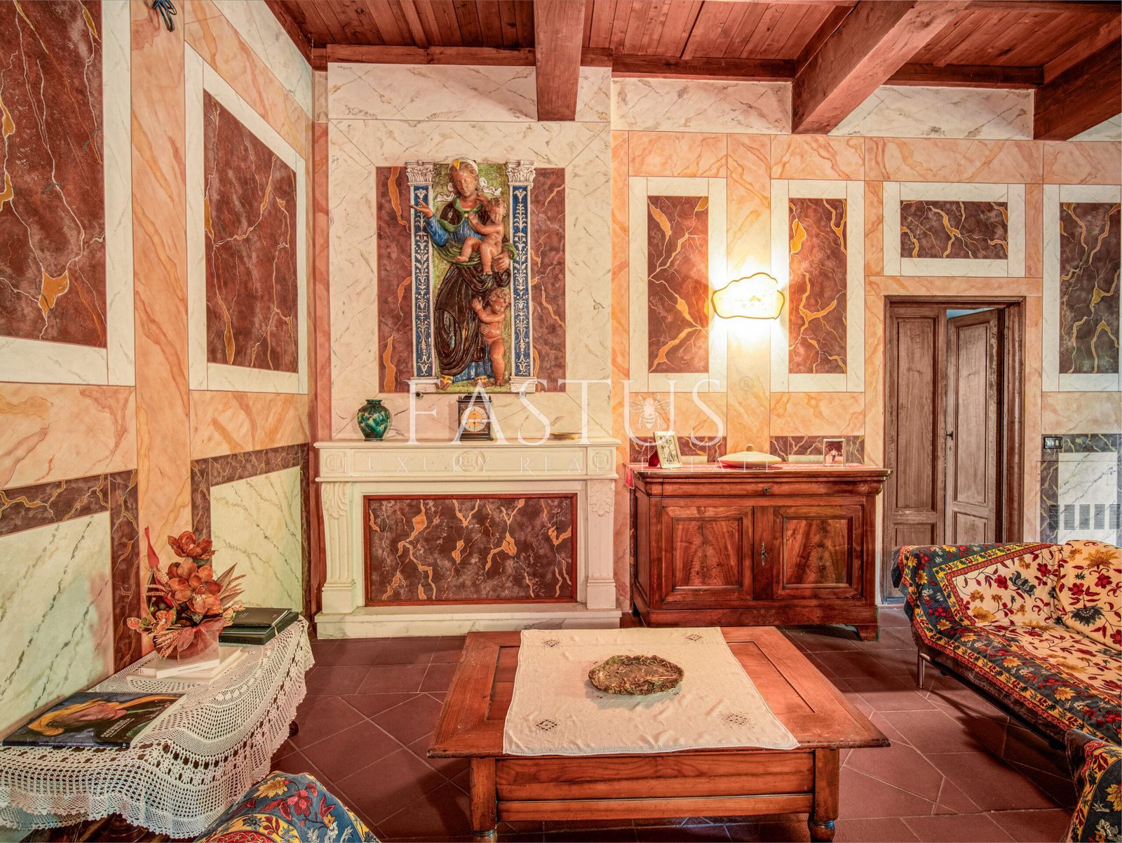 All’interno, la villa principale di circa 780 mq si sviluppa su tre piani, rivelando un glorioso passato attraverso i suoi affreschi originali, i pavimenti in cotto e le travi in legno che ne testimoniano l’autenticità. Al piano terra, un sontuoso salone affrescato accoglie gli ospiti con un elegante camino in marmo, affiancato da una spaziosa cucina con un antico camino in cotto e una sala da pranzo impreziosita da un altro raffinato focolare. Completano questo piano una seconda cucina con forno a colonne, uno studio e due bagni di servizio, garantendo comfort e funzionalità.