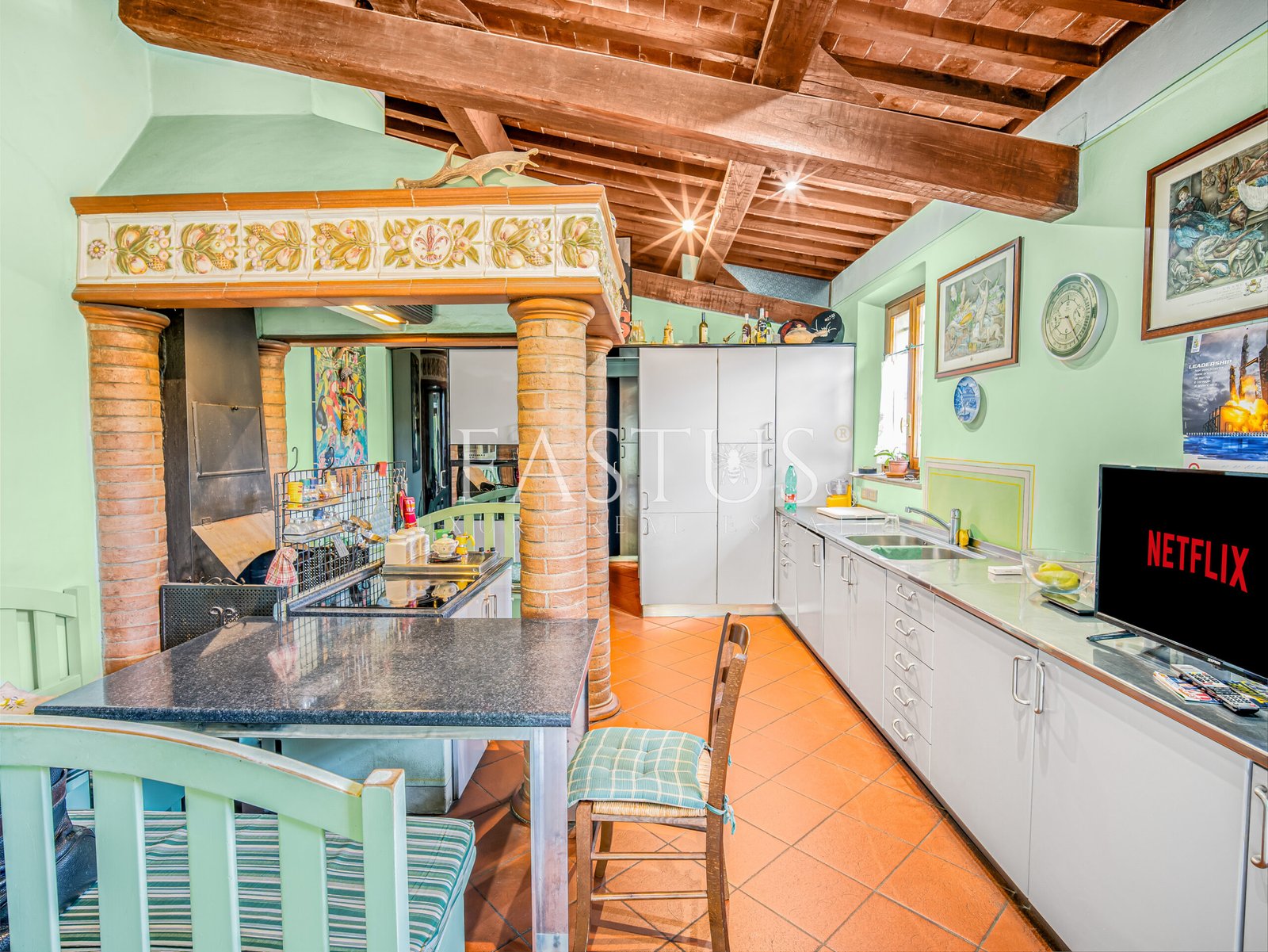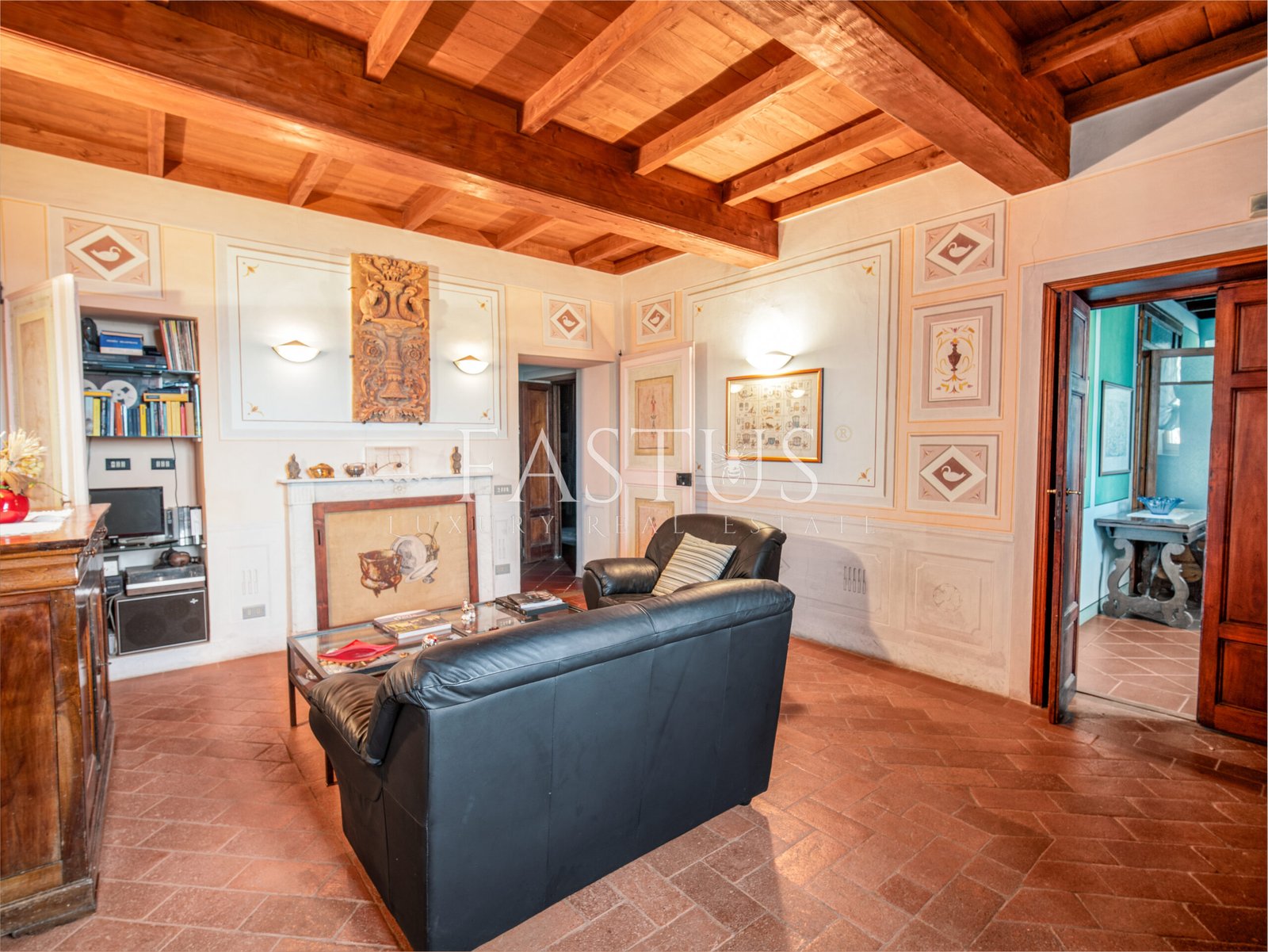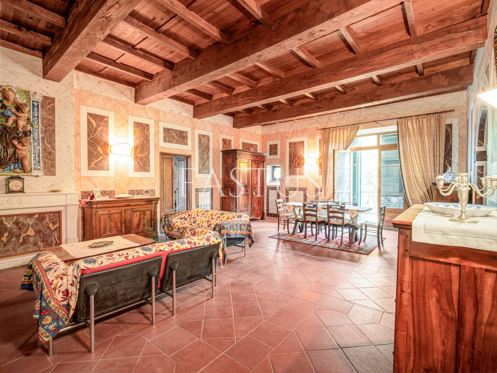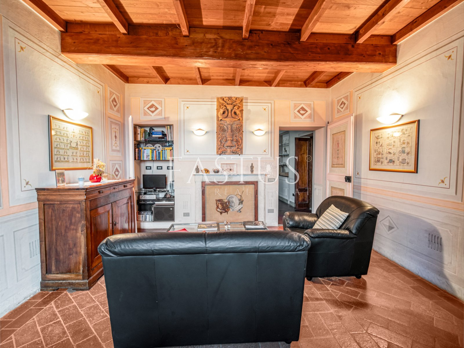 All’interno, la villa principale di circa 780 mq si sviluppa su tre piani, rivelando un glorioso passato attraverso i suoi affreschi originali, i pavimenti in cotto e le travi in legno che ne testimoniano l’autenticità. Al piano terra, un sontuoso salone affrescato accoglie gli ospiti con un elegante camino in marmo, affiancato da una spaziosa cucina con un antico camino in cotto e una sala da pranzo impreziosita da un altro raffinato focolare. Completano questo piano una seconda cucina con forno a colonne, uno studio e due bagni di servizio, garantendo comfort e funzionalità.