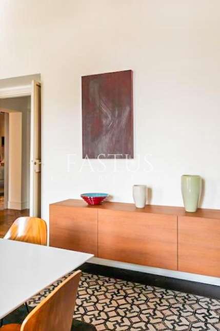 Situato al terzo piano, l’appartamento colpisce immediatamente per i suoi soffitti alti circa 4 metri, che amplificano la sensazione di spazio e luminosità. Gli ambienti sono impreziositi da maioliche antiche, parquet originali a motivi geometrici, soffitti a cassettoni decorati e grandi aperture che permettono alla luce naturale di valorizzare ogni dettaglio architettonico.