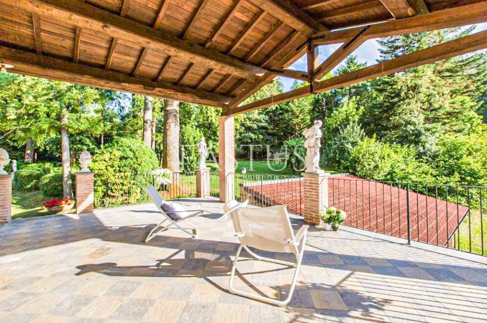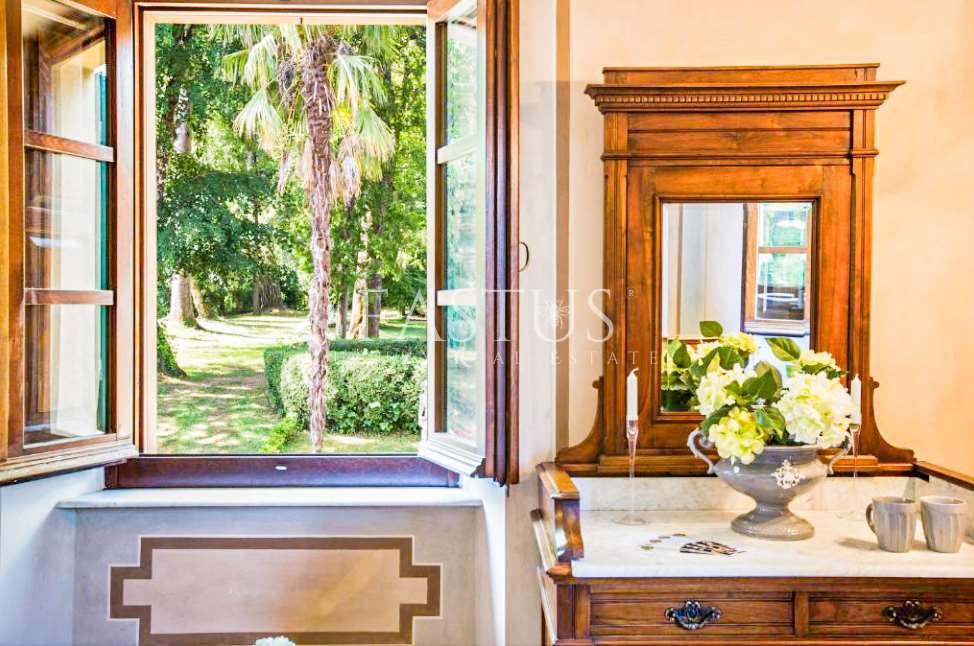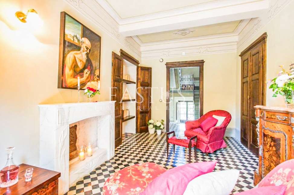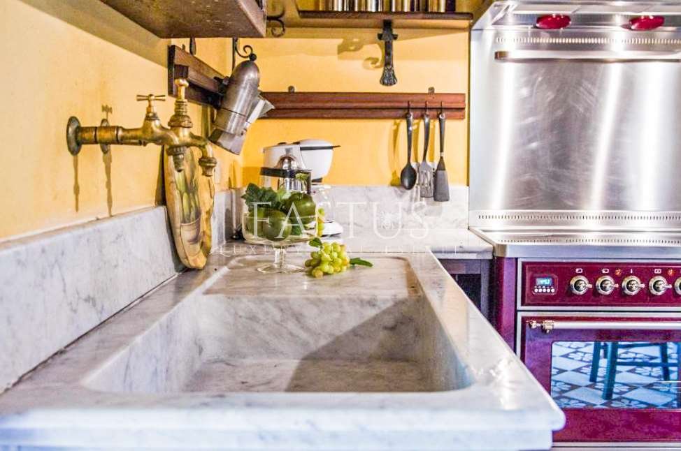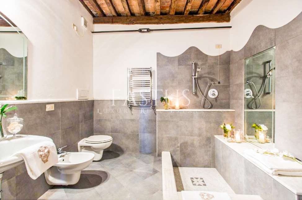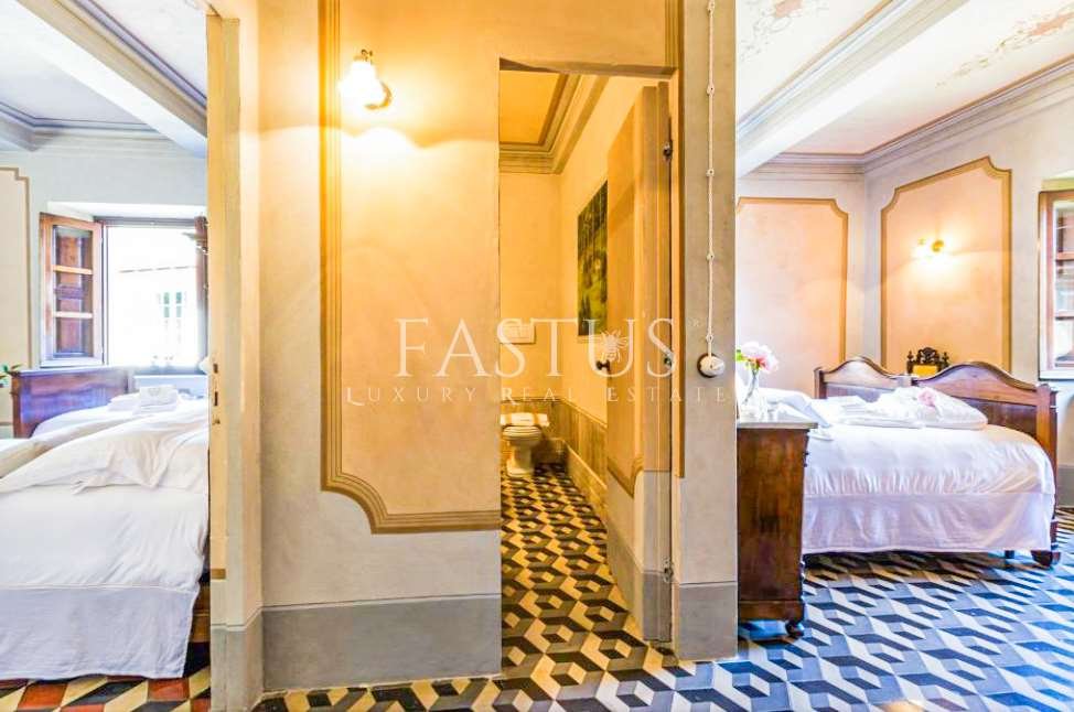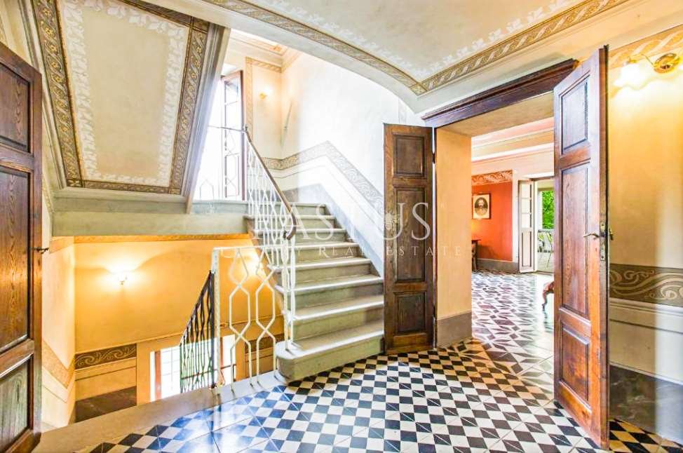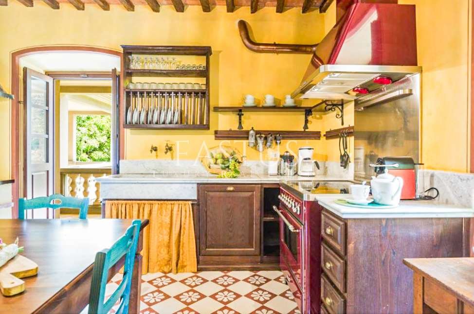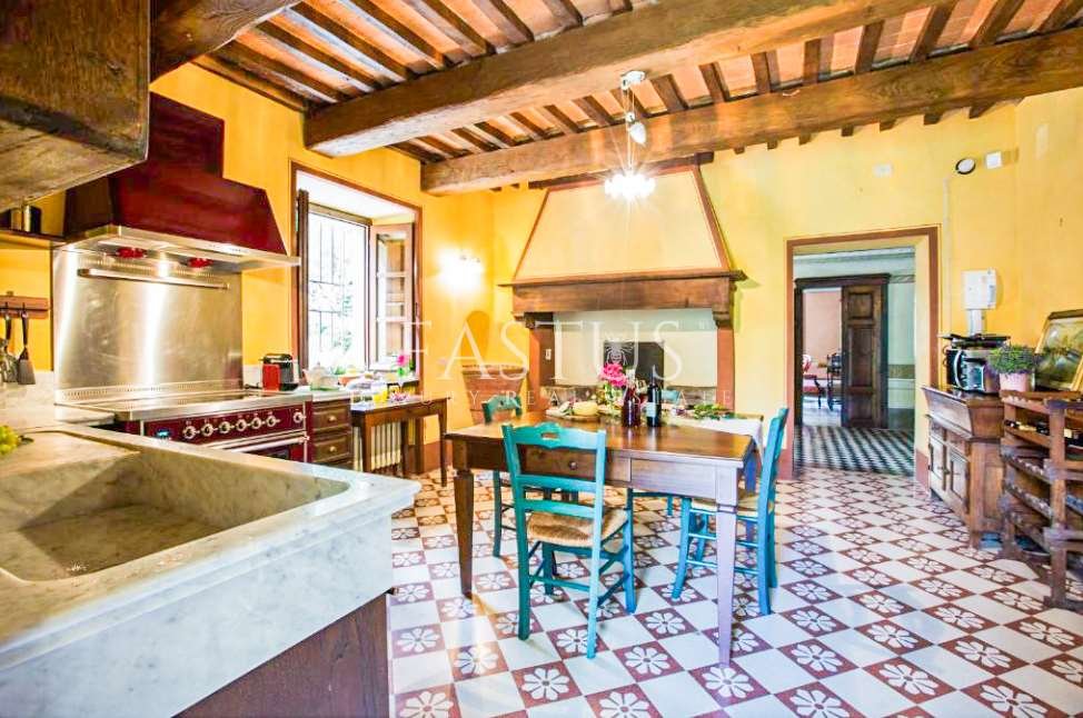 La villa, risalente al 1800, conserva il fascino e l’eleganza delle dimore nobiliari dell’epoca, arricchita da una ristrutturazione di alto livello che ha saputo valorizzare gli elementi architettonici originali pur integrando i comfort moderni. La struttura principale si sviluppa su quattro piani, con un ampio salone al piano terra, dove soffitti alti, dettagli storici e mobili d’epoca creano un’atmosfera di grande prestigio. L’area giorno comprende un secondo salotto con zona TV e una cucina in stile toscano antico, spaziosa e perfettamente funzionale, ideale per chi ama cucinare in un ambiente elegante e suggestivo.