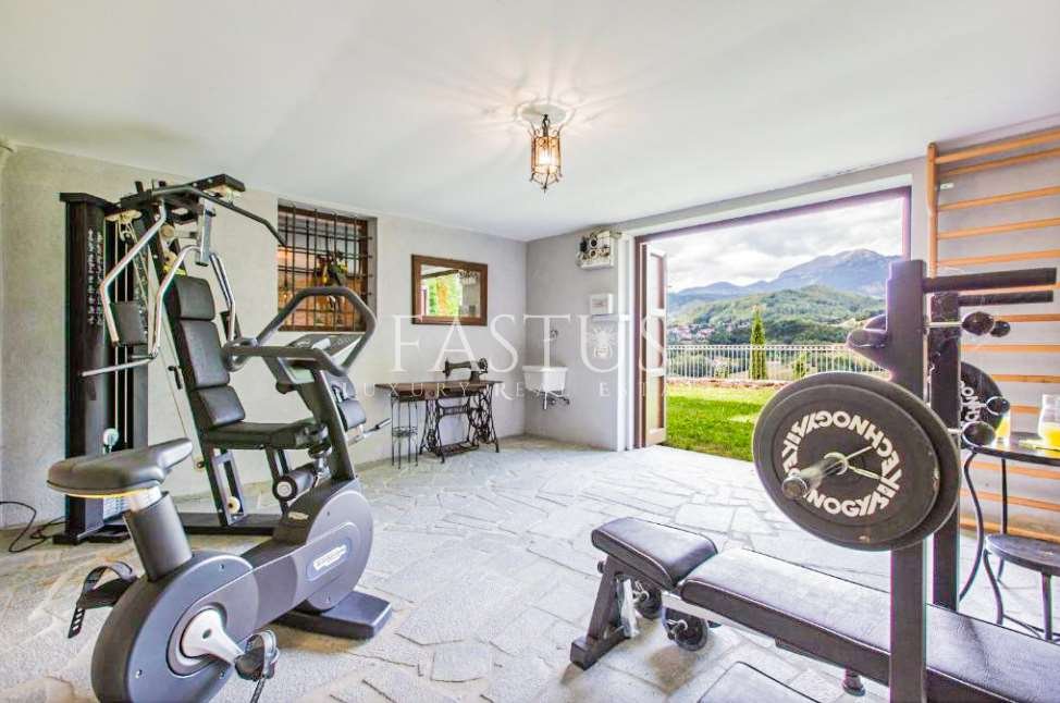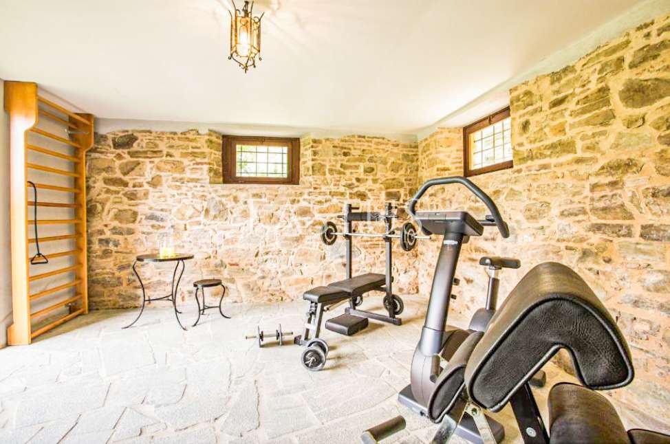 Al piano interrato, la villa sorprende con un’area dedicata al relax e al divertimento: una vasca jacuzzi per otto persone, una wine room, un bagno in marmo toscano e travertino romano, una lavanderia completa e una palestra ricavata all’interno di un’antica sala con mura in pietra naturale. L’area è inoltre arricchita da un pianoforte e da un biliardino, per momenti di intrattenimento e svago in piena privacy.